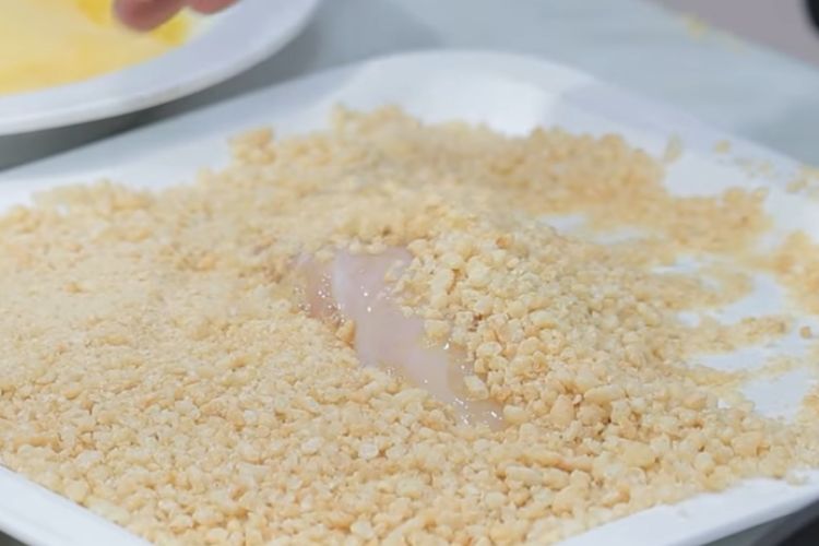 - Rebozamos el polloSalamos los solomillos de pollo, por ambos lados, y los pasamos por huevo batido y por el rebozado de cereales. Debemos de cubrirlo bien para que se adhiera a todo el pollo.