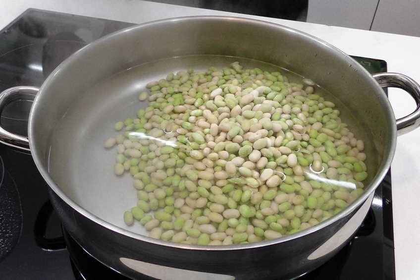 - Poner a cocer las pochasComenzamos poniendo una cazuela con agua a calentar y cuando esté hirviendo ponemos un puñadito de sal y las pochas. Estarán cociendo a fuego lento durante 25-30 minutos.