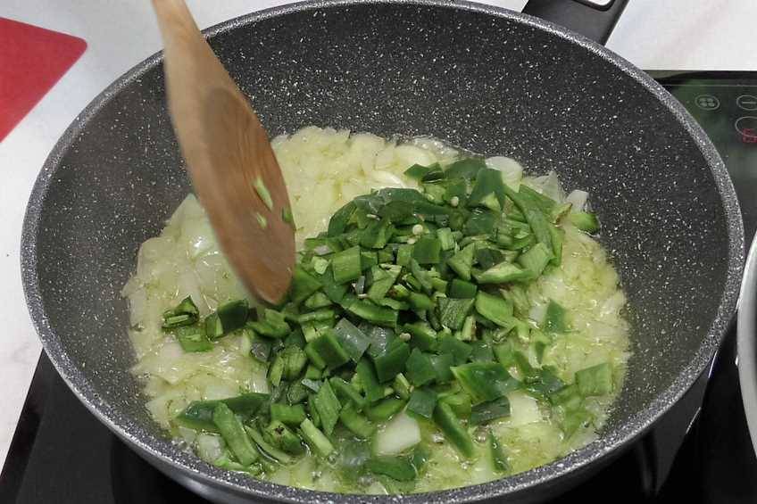 - Sofreímos el ajo, la cebolla y el pimiento verdePor otro lado ponemos una sartén con aceite de oliva a calentar y cuando lo esté, añadimos la cebolla y los ajos picaditos. Cuando la cebolla esté transparente ponemos el pimiento verde picado.