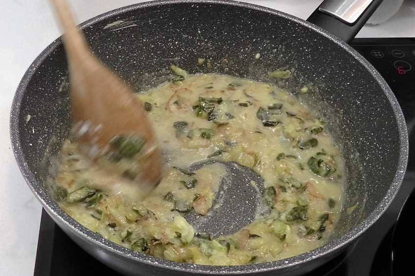 - Ponemos el vino blanco y espesamos la salsaUna vez se haya hecho el pimiento, le ponemos una cucharada sopera de harina de maíz. Removemos para que se cocine y se haga una especie de pasta y vertemos la copa de vino blanco.