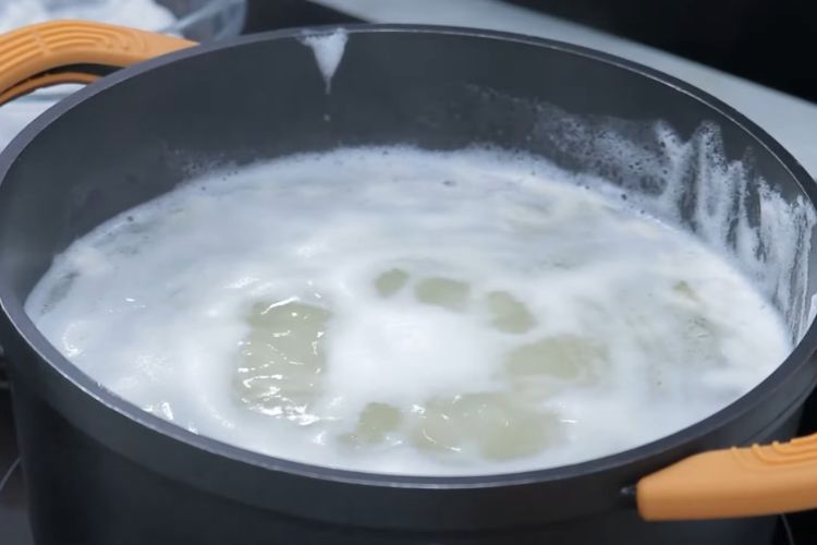 - Ponemos a hervir las alubiasEn una olla, ponemos a cocer las alubias en agua con sal (las alubias las habremos puesto a remojo la noche anterior). Retiraremos la espuma que vaya creando.