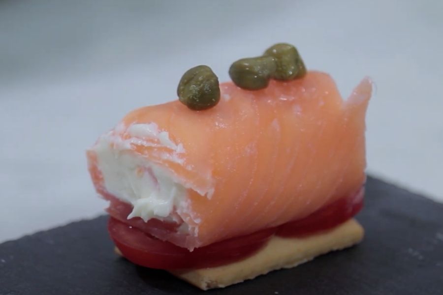- Empezamos a preparar el primer canapéMezclamos queso crema con un poco de miel y lo untamos sobre el salmón ahumado. Después, cortamos en tiras, y enrollamos el salmón.