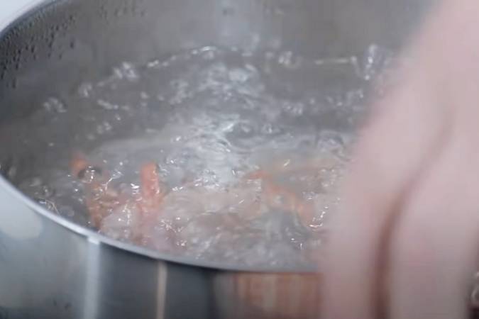 - Cocer las gambasPara cocer las gambas, ponemos una cazuela con abundante agua a calentar. Cuando comience a hervir, ponemos 1 cucharada sopera de sal por cada litro de agua. En que la sal esté disuelta, vamos cociendo las gambas poco a poco, sin poner muchas de golpe. Estarán cocidas 1 minuto después de que el agua vuelva a hervir (dejará de hervir cuando pongamos las gambas). Una vez cocidas, las sacamos a un bol con agua muy fría para cortar la cocción.