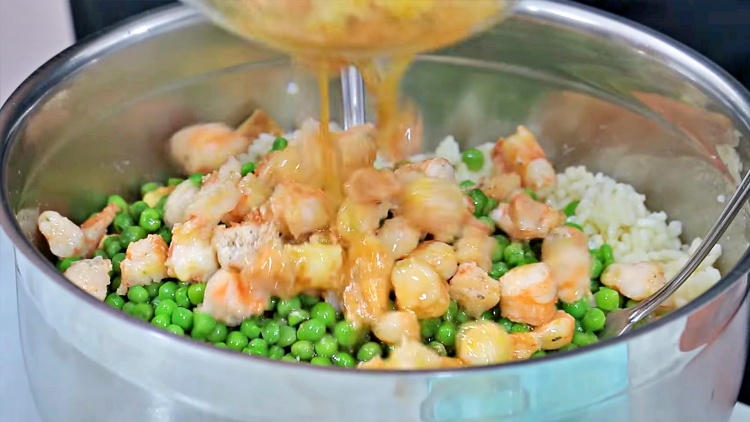 - Pelamos y cocinamos los langostinosMientras se enfría el arroz, vamos a ir cocinando el resto de ingredientes. Comenzamos pelando los langostinos y los cortamos en trozos al gusto. Los cocinaremos en una sartén con aceite, sal y ajo en polvo. Una vez cocinados los sacamos a un bol junto al aceite en el que los hemos cocinado para que se enfríen.