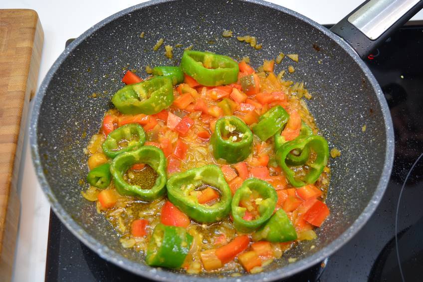 - Sacar los pimientos y la zanahoria y ponerlos con el sofritoEn ese punto, cuando los pimientos y la zanahoria estén cocidos, los añadimos al sofrito junto con un poco del caldo de la cocción de las lentejas con chorizo.