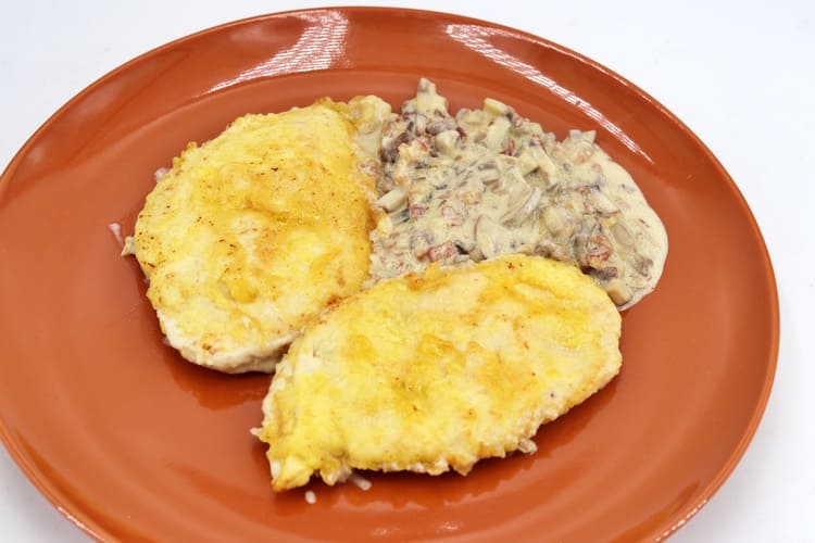 - Servimos y disfrutamosYa tenemos listas nuestras pechugas de pollo rebozadas con salsa de champiñones, jamón y nata. ¡Una delicia!