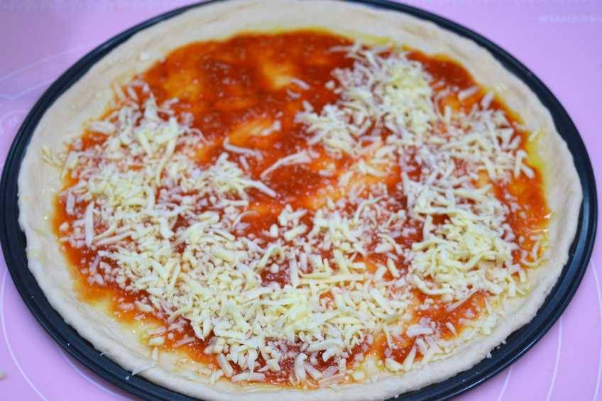 - Estiramos la masa para montar la pizzaExtendemos la masa con las manos, sobre la bandeja circular donde vamos a hacer la pizza en el horno. Ponemos aceite de oliva en la superficie y lo extendemos ayudándonos de una brocha de cocina. Luego le ponemos salsa de tomate dejando un círculo de masa alrededor y después ponemos queso mozzarella rallado.