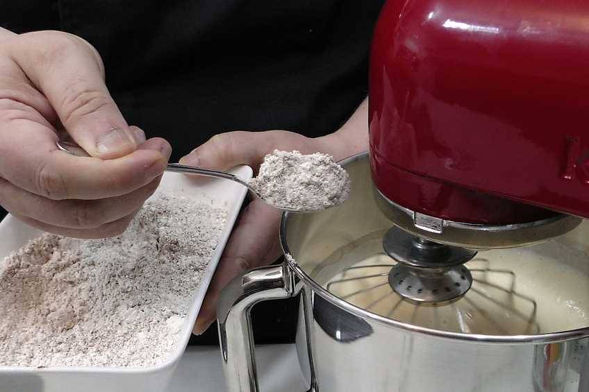 A continuación, mezclamos el café y la levadura con la harina, y vamos añadiéndolo al bol mientras bate a velocidad baja.