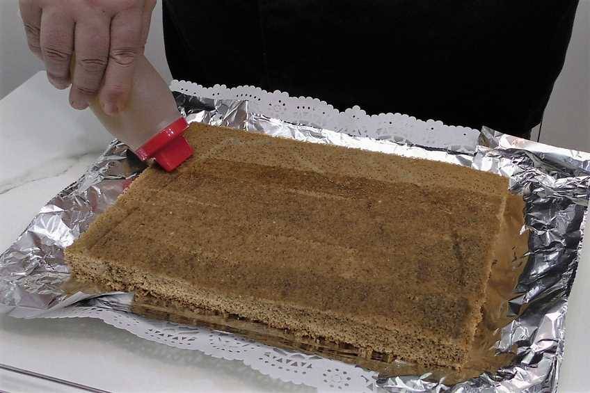 Cuando tengamos todo listo, iniciamos el proceso de montaje de la tarta. En la bandeja que la vayamos a presentar, colocamos unos trozos rectangulares de papel de aluminio que cubran bien los bordes de la misma para que al montar la tarta no se ensucie. Luego pinchamos el bizcocho con un tenedor para que empape bien el almíbar.