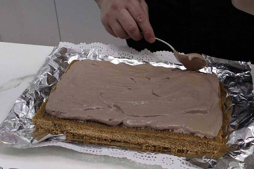 Acto seguido ponemos una buena capa de nata de chocolate y la extendemos bien por toda la superficie del bizcocho.
