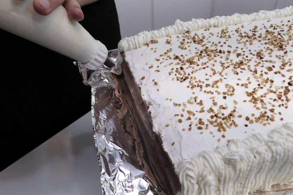 Colocamos la otra lámina de bizcocho encima y la cubrimos con una buena capa de crema de queso y espolvoreamos almendra crocanti al gusto.