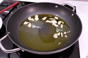 Freír los ajosComenzamos pelando y cortando los ajos en láminas. Luego los ponemos a sofreír en una cazuela plana con un poco menos de un dedo de aceite de oliva cubriendo el fondo.