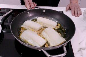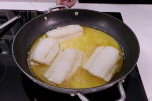Cocinar el bacalao a baja temperaturaCuando los ajos comiencen a dorarse, colocaremos los lomos de bacalao en la cazuela con la piel hacia abajo. De esta forma facilitaremos la extracción de gelatina del bacalao, ya que la mayor parte está concentrada entre la piel y la carne del bacalao. Recordad que la temperatura óptima de cocinado para el bacalao es de unos 60ºC, por lo que no debéis tener el fuego alto cuando lo pongáis en el aceite.