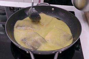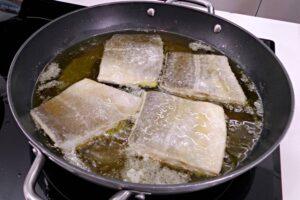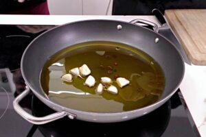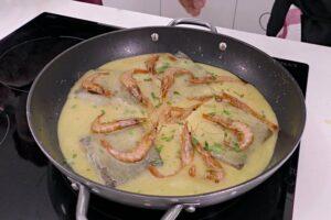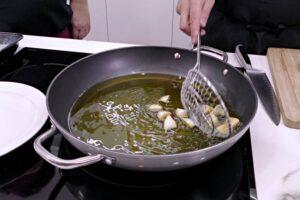 Infusionar el aceite con los ajos y la guindillaLo primero que haremos será poner abundante aceite de oliva en una cazuela plana. Para 4 tajadas como las que he utilizado, más o menos medio litro de aceite. Debemos poner el fuego medio-bajo para freír los ajos. Los pondremos sin pelar y cortados por la mitad, junto con la guindilla cortada en rodajitas. No hace falta cortarlos más, porque para infusionar el aceite no necesitamos más. Retirar los ajos y esperar a que se enfríe un poco el aceiteCuando los ajos estén dorados, los retiraremos del aceite al igual que la guindilla. Ahora tenemos que esperar a que el aceite pierda temperatura, por lo que lo retiraremos del fuego. En que podamos meter el dedo sin quemarnos, es el momento de cocinar el bacalao. Cocinar el bacalao para que suelte la gelatinaColocamos de nuevo la cazuela en el fuego, que pondremos a la intensidad más mínima posible para que mantenga esa temperatura el aceite. Ponemos las tajadas de bacalao con la piel hacia arriba, cosa que haremos por 2 motivos. El primero es que al salir la gelatina, hará contacto con la carne del bacalao de una forma más sencilla, por lo que nos quedará más jugoso. El otro es para comprobar cuando el bacalao está hecho. Mientras no lo esté, será muy difícil atravesar la piel haciendo presión con un cuchillo. Cuando esté hecho, podréis atravesarla con facilidad. Separar la gelatina del aceiteUna vez tengamos el bacalao listo, lo retiraremos de la cazuela y lo reservaremos. Acto seguido, con la ayuda de un cazo, iremos sacando el aceite de oliva a un recipiente y la gelatina a otro. Tenemos que dejar que el aceite y la gelatina se atemperen para asegurar el éxito. Si están demasiado calientes, no ligarán bien. Empezar a batir la gelatinaAhora dispondremos un bol que podamos manejar con comodidad y utilizaremos un batidor de varillas manual para hacer la emulsión. Comenzaremos poniendo un poco de gelatina (la que ha sudado el bacalao en el plato en el que lo hemos reservado) y batiendo a buena velocidad, hasta que veáis que se convierte en espuma. Añadimos un poquito de aceite de oliva y mientras seguimos batiendo. Alternar aceite y gelatina hasta haber puesto todoSeguiremos así, alternando el añadir gelatina y aceite, teniendo en cuenta siempre que debe haber más gelatina que aceite hasta el final, que habrá más o menos la misma cantidad. Cocinar las gambasDejamos reposando la salsa y mientras tanto, cocinamos las gambas en una sartén con un chorro de aceite de oliva. Ponemos a sofreír un par de dientes de ajo cortados en láminas y unos aros de guindilla seca. Cuando el ajo comience a dorarse, agregamos las gambas y las salteamos hasta que estén completamente naranjas. Volcar el pil pil a la cazuela y colocar las tajadas de bacalaoEn ese punto, retiramos las gambas y volcamos el aceite (sin el ajo y la guindilla) en el bol del pil pil. Lo mezclamos bien con el resto y lo volcamos poco a poco en la cazuela en la que hemos cocinado el bacalao junto con las 4 tajadas. Calentar todo a fuego bajoLo calentamos a fuego medio-bajo un rato antes de comerlo. No lo calentéis demasiado o podría desligarse la salsa. Colocamos las gambas encima del bacalao o las servimos directamente en las raciones individuales. Ya hemos terminado el bacalao al pil pilY ya está amig@s, hemos terminado nuestro bacalao al pil pil con gambas a la plancha. Espero que lo preparéis muy pronto en casa y subáis la foto final a Instagram, mencionando mi cuenta @cocinafamiliarjr. Así veré que habéis hecho una de mis recetas y me pondré muy contento. Nada más por hoy, mañana más y mejor aquí, en Cocina Familiar.