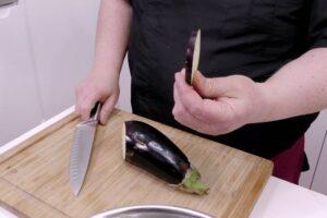 Cortamos las berenjenasComenzaremos cortando la berenjena en rodajas de medio centímetro más o menos.