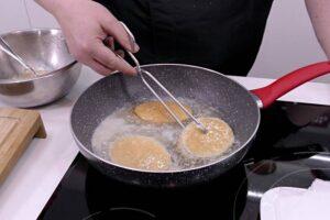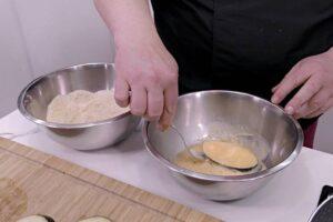 Empanamos las rodajas de berenjenaUna vez tengamos las rodajas secas, las sazonamos y las pasamos por pan rallado, huevo batido y de nuevo por pan rallado.
