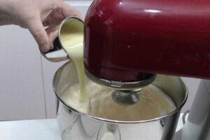 Añadir la leche y la leche condensadaUna vez tengamos la mezcla en ese punto (que será después de 6-7 minutos batiendo a velocidad alta), añadimos la leche condensada y la leche.