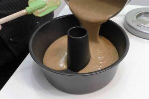 Volcar la masa en el moldeEn el momento que tengamos toda la harina integrada, engrasamos el molde con spray desmoldante y encendemos el horno a 180ºC con el calor arriba y abajo SIN ventilador. Luego vertemos la mezcla en el molde y esperamos a que el horno se caliente.