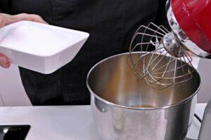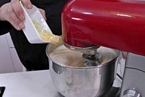 Turno de la harina y la levaduraAhora bajaremos la velocidad al mínimo e iremos añadiendo la harina mezclada con la levadura cucharada a cucharada, mientras se va integrando en la masa del bizcocho.