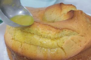 Agregamos el almíbar al bizcochoPor último, vamos a glasear el bizcocho con el almíbar. Previamente habremos pinchado con un tenedor el bizcocho para que el almíbar penetre bien en él.