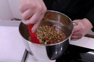 Agregar las nuecesCon la masa lista, añadimos las nueces picaditas en trozos de un tamaño que nos guste. Luego las integramos en la masa para que queden bien repartidas.