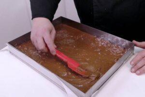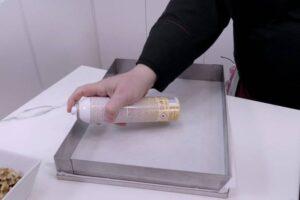 Preparar el moldeCon la masa lista, tenemos que preparar el molde. En mi caso, he utilizado un molde rectangular desmontable de 30×40 cm. Es grande y el brownie queda finito. Si no tenéis un molde así, que por otro lado es lo más probable, tendréis que adaptar la cantidad de los ingredientes al vuestro. Ponemos un papel de horno entre la base y el lateral del molde y luego rociamos todo el interior con spray desmoldante.