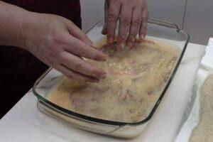 Pasamos por huevo el cachopoEn una fuente grande y honda, batimos los huevos necesarios para poder pasar el cachopo asturiano por huevo sin problema. Cuida que se pringue bien de huevo ya que este es el que va a sellar el filete. Si dejas zonas sin cubrir de huevo, luego vas a tener problemas a la hora de empanarlo.