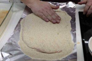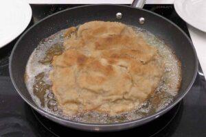 Empanamos el cachopoPor último lo pasaremos por pan rallado aplastando el filete para que se pegue el pan al huevo de forma perfecta. Si quedara alguna zona sin cubrir, pon más huevo batido en esa zona con una brocha de cocina y cubrela con el pan rallado. Si te gusta con doble empanado (en mi opinión no es necesario), solo tienes que volver a pasar por huevo el cachopo asturiano y nuevamente por el pan, deja que reposen un poco mientras se calienta el aceite.y pondremos a calentar abundante aceite en una sartén del tamaño adecuado. Si tenéis la suerte de disponer de una freidora muy grande, os recomiendo hacerlo en la freídora, pues el empanado quedará mejor.