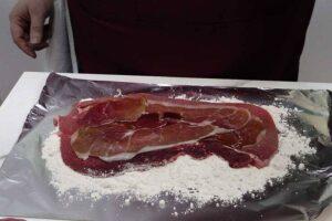 Rellenamos el cachopoEs el momento de rellenar el cachopo. Cubrimos el filete con jamón dejando un cm sin cubrir alrededor de todo el filete para luego poder pegarlo con el que lo vamos a cubrir. Una vez puesto el jamón pondremos el queso, ten en cuneta que el queso se va a fundir algo y que quizás se salga si pones mucho. También debes tener en cuenta que hemos puesto queso curado y si ponemos mucho, puede que domine demasiado el sabor.Una vez con el relleno bien colocado, cubrimos con el otro filete y lo enharinamos convenientemente, procura que se pringue bien con la harina ya que es la que va a sujetar el huevo.