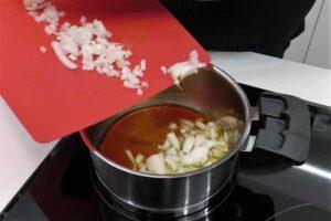 Hacemos un sofrito con los ajos y la cebollaComenzamos picando los ajos y la cebolla y poniéndolos a sofreír en un cazo con un poco de aceite de oliva y vamos cocinado a fuego medio – bajo.