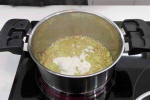 Seguimos con el sofritoCuando se dore la cebolla, ponemos media cucharada de harina y removemos para integrarla. Una vez conseguido, ponemos el caldo de carne (que podéis preparar disolviendo 2 pastillas de caldo concentrado en agua calentándolas un poco) y removemos.