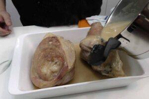 Seguimos con el horneado del codillo de cerdoDevolvemos la bandeja al horno y dejamos que se hagan los codillos por ese lado durante 20 minutos. Pasado ese tiempo sacamos la bandeja, damos la vuelta a los codillos y los devolvemos al horno durante 15 minutos más para que se doren por el otro lado, pero esta vez a 200º Centígrados.