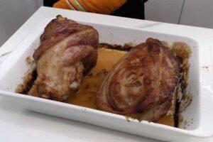 Comenzamos el horneado de los codillos de cerdo Mientras se va dorando la cebolla, encendemos el horno a 180º Centígrados, con el calor arriba y abajo sin ventilador. Ponemos los codillos en una fuente grande y cuando esté el horno caliente la metemos para hornear los codillos de cerdo 10 minutos para empezar.