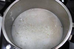 Comenzamos a preparar nuestro arroz con leche y chocolate blancoLo primero será poner el agua en una cazuela, agregarle una pizca de sal y el arroz para que vaya soltando el almidón.