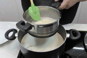 Agregamos el arroz a la cazuela de la lecheCuando el arroz haya absorbido todo el agua, lo agregamos a la cazuela en la que tenemos la leche, debemos dejarlo cocer durante aproximadamente 90 minutos a fuego lento, lo justo que veamos alguna burbuja salir a la superficie.