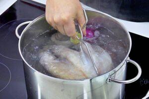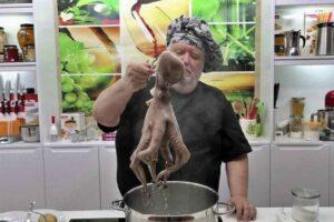 Cómo asustamos al pulpoPara cocer el pulpo debemos disponer una cazuela en la que entre holgadamente y poner a hervir el agua. No debemos poner sal ya que eso hace que se deshaga la piel del pulpo. Para cocer el pulpo solo añadiremos una hoja de laurel y si te apetece unos granos de pimienta sin moler…Una vez que tenemos el agua hirviendo vamos a asustar al pulpo, esto no consiste en soltarle un grito no, jajaja, el animal está muertoooo. Consiste en sumergirlo durante unos segundos y sacarlo otra vez del agua hirviendo. Así durante tres veces, a la cuarta ya lo dejamos en el interior del agua para su cocción. Con esto conseguimos que los tentáculos se recojan y faciliten la cocción.