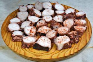 Preparación del pulpo a feiraLo tradicional es utilizar un plato de madera, si no tienes utiliza cualquier otro. Vamos troceando los tentáculos en un tamaño a nuestro gusto y los vamos colocando en el plato sin ponerlos amontonados.