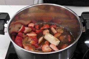 Juntar los ingredientesLuego las ponemos en la cazuela junto con el azúcar, la mantequilla y el agua, y ponemos el fuego a media intensidad.