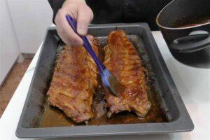 Si la bandeja está seca puedes echarle un poco de agua para que no se quemeSi veis que en la bandeja no hay nada de agua, ponéis un poco para que no se queme. Pasados los 15 minutos, sacamos la costilla del horno y le damos un último pringue de salsa justo antes de sentarnos a la mesa a comer.