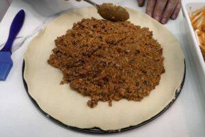 Colocamos una lámina de hojaldre sobre una bandeja y agregamos el relleno de carneUna vez terminado el relleno, disponemos una bandeja redonda, donde pondremos una de las láminas de hojaldre. A continuación, ponemos una capa de relleno en el centro haciendo forma de círculo, tal y como se ve en la foto.