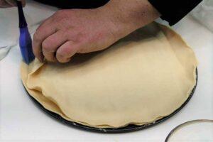 Sellamos la empanada con otra lámina de hojaldrePintamos el borde del hojaldre con huevo batido y ponemos la otra lámina encima.