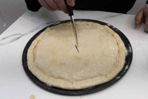 Pintamos la empanada con huevoAhora pintamos el resto de la empanada con huevo por encima y plegamos el sobrante del hojaldre hacia adentro. Finalmente hacemos un corte pequeño en el centro del hojaldre para que salgan los vapores que se generan al asarla.