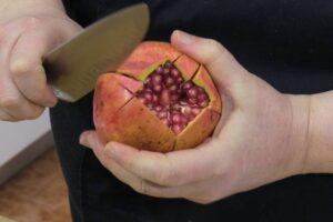 Abrir la granadaAhora vamos realizando cortes en la piel exterior de la granada, a la misma altura de la separación de sus gajos. Luego vamos abriendo la granada despacio hasta que quede igual que en la foto.