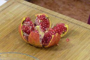 Desgranar la granadaVamos sacando poco a poco los granos y los añadimos al bol de la ensalada de aguacate.