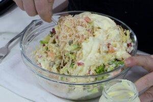 Añadir la mayonesa y mezclarEs el momento de poner una buena cantidad de mayonesa y mezclar toda la ensalada de aguacate y gambas. Cuando esté todo bien mezclado, será el momento de valorar si necesita más mayonesa o no. Es mejor ir poco a poco porque eso sí que tiene arreglo. El problema viene cuando nos pasamos de cantidad.