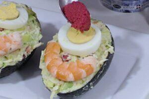 Presentar la ensalada de aguacateCuando tengamos lista la ensalada de aguacate, rellenamos bien las medias cáscaras de los aguacates. Creo que es una presentación muy original y luego le podemos poner por encima algunas de las cosas que hemos utilizado en la ensaladilla, como huevo cocido o algún langostino pelado.