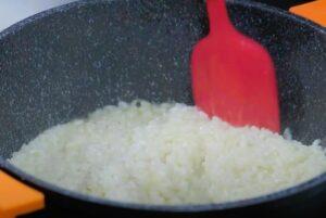 Hervimos el arrozEl primer paso es cocer el arroz. Ponemos a calentar aceite en una cazuela y añadimos el arroz. Salamos y ponemos ajo y cebolla en polvo. Removemos, freímos levemente y cubrimos con 850 ml de agua. Volvemos a remover un poco y cocemos. Cuando el agua se consuma, lo retiramos del fuego.