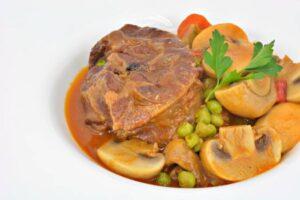 Cómo hacer un estofado de ternera a la jardinera. Un guiso con una buena carne de ternera, champiñones, patatas, verduras, tomate frito y vino blanco.