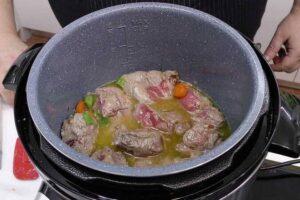 Cómo hacer el estofado de ternera a la jardinera en la olla a presiónEl principio del guiso es el mismo, sellaremos la carne, haremos el sofrito de verduras, volvemos a poner la carne y añadiremos el vino blanco, tomate frito y agua. Podrías poner las patatas, guisantes y champiñones pero estarán sobre cocinadas, mi consejo es que lo hagas una vez hecha la carne.Para cocer la carne, debes cerrar la olla y cocinarla durante 30 minutos a presión máxima en olla rápida, si es una olla a presión de las antiguas, el tiempo será de una hora. Pasado este tiempo y una vez despresurizada la olla, añades los guisantes y champiñones para cocinarlo durante 20 minutos. De esta forma, espesará el caldo que en la olla se queda muy líquido y te recomiendo poner encima las patatas fritas previamente.