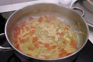 Sofreír las verdurasCuando tengamos la carne dorada la sacamos a un bol para hacer el sofrito en el mismo aceite. Comenzamos pelando y picando en trozos pequeños los ajos, la cebolla y la zanahoria. Una vez hecho, lo pondremos todo en la cazuela con una pizca de sal. Cuando la cebolla comience a transparentar, añadimos el pimiento rojo picadito y dejamos que se cocine todo a fuego lento.